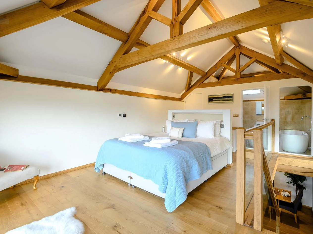 This charming and spacious former farm building, approached by a private driveway, is situated on the edge of a working farm, nestled in the corner of an open field amongst open countryside and farmland. Upon entering the beautiful accommodation, you are greeted with a light and airy open-plan lounge/diner with rugged exposed beams and a timber floor. In the summer you can open the doors to the sun-trap garden to let the outside in, or in the cooler months snuggle up on the comfy sofa in front of the wood burner while watching your favourite programme on the Smart TV. This room flows through to the perfectly equipped kitchen, a great space for cooking lazy breakfasts or trying out new recipes. There is also a utility/boot room with a washing machine, ideal for storing muddy boots after a walk in the countryside, or drying muddy paws. Head upstairs from the lounge/diner to the spacious master bedroom, complete with super-king-size bed, a spectacular vaulted ceiling and a floor-to-ceiling window boasting gorgeous countryside views. There is a luxury en-suite bathroom with free-standing bath and separate shower.