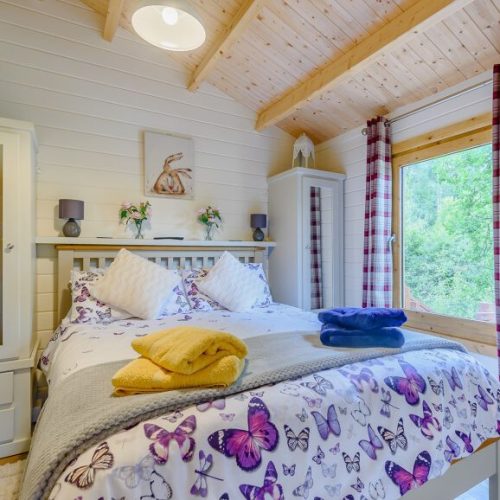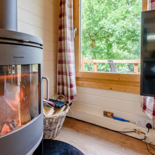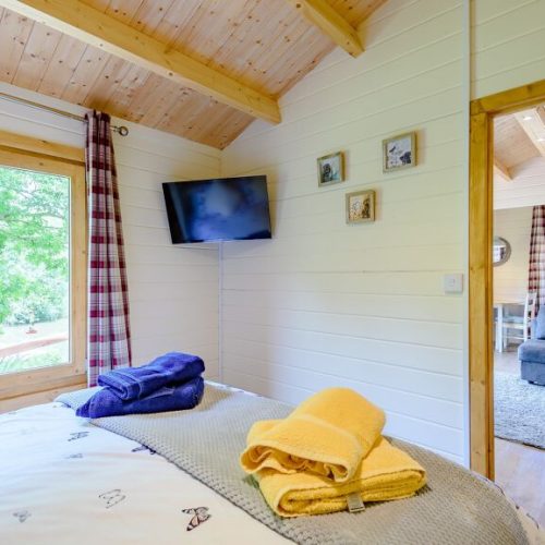 Head through the lodge’s patio doors, into the stylish open-plan lounge/kitchen/diner which comes complete with electric oven and hob, microwave and fridge/freezer. The dining table is a great place to enjoy a continental breakfast or a sumptuous evening meal cooked up in the well-equipped kitchen with electric oven and hob, microwave and fridge freezer. After a full-on day exploring why not retreat to the comfy sofa in front of the cosy wood burner and enjoy either your favorite film on TV or the beautiful views over the ponds, enjoying the ever changing scenery. The master bedroom, that also benefits from those beautiful ponds views, features a double bed and a wall mounted TV. Finally, the spacious shower room and WC completes the interior of this lodge.