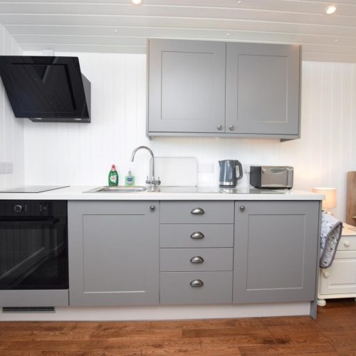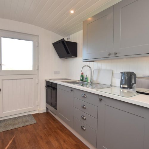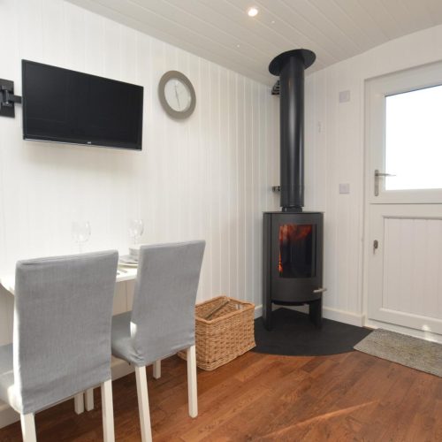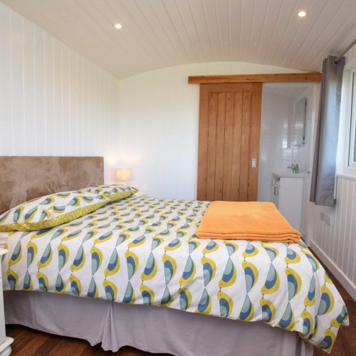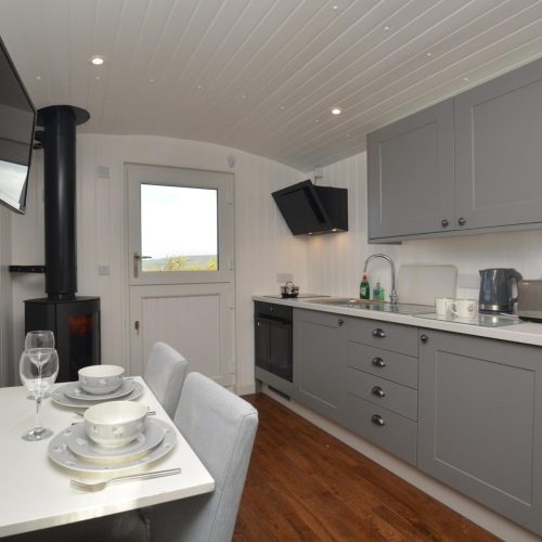 Adjacent to the owners’ home, yet with privacy assured, stepping stones lead to the covered entrance into this purpose-built shepherd’s hut, which is positioned to make the most of the amazing views. Once inside you are met with a surprisingly spacious studio area, with the kitchen to your left and room to dine to your right. A wood burner keeps the space cosy whatever the season and you can enjoy watching your favourite shows on the TV whilst you snuggle up in the double bed. A door at the rear leads into the contemporary shower room with WC.
