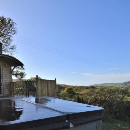 To the front of the hut is a generous raised deck with furniture. From here you can see for miles and if you’re lucky you’ll catch a glimpse of the sea on a clear day. Enjoy a sundowner or your morning coffee before sinking into the private hot tub, which is tucked beside the hut and surrounded by an area of lawn, enclosed by hedging.