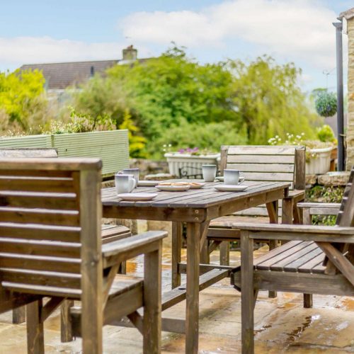 Stepping outside, you will find a sheltered stone patio with garden furniture, making a lovely spot to enjoy a spot of lunch or a morning coffee.