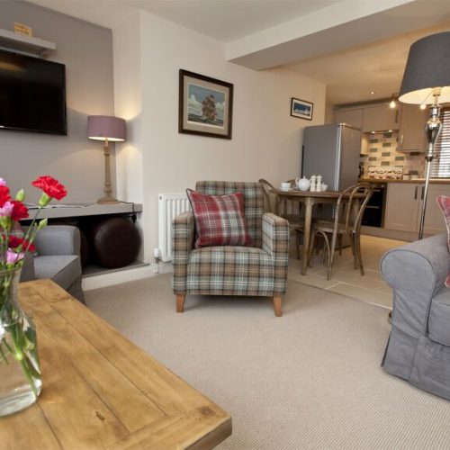 Enjoying a stunning view of Whitby Abbey, this centrally located apartment has been stylishly designed, tastefully decorated and features a spacious open-plan lounge/kitchen/diner on the first floor. The welcoming lounge features comfortable seating and a TV, and two Georgian windows which overlook the town. There’s also a charming dining area, and the attractive kitchen is fully equipped with an oven, fridge/freezer, dishwasher and a coffee maker. Heading down to the ground floor you will find the beautiful master bedroom which features a double bed and is situated next to the shower room which has a large walk-in shower and WC. Heading up to the second floor, there’s a twin room set in the eaves of the building, which also has an en-suite WC.