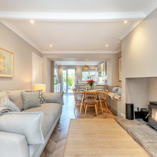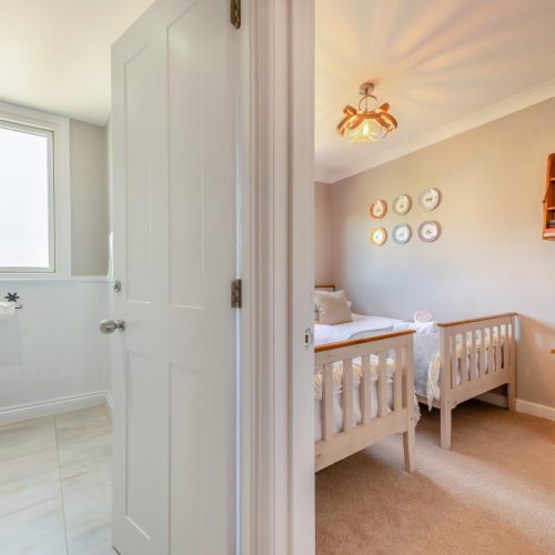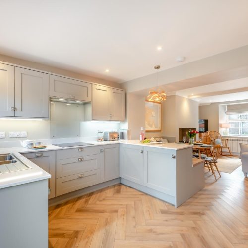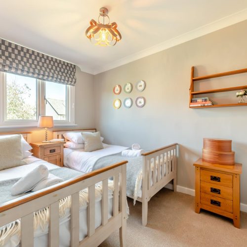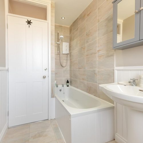 The welcoming cottage features a bright open-plan lounge/kitchen/diner with windows at the front and rear, filling the space with natural light. The comfortable lounge area includes a large sofa and rocking chair positioned around a cosy wood burner, alongside a Smart TV for entertainment. The well-equipped kitchen has all you need for preparing meals, with a dining area offering ample seating for everyone to enjoy meals together. French doors open to the garden, creating a seamless indoor-outdoor living experience in warmer months. Upstairs, the double bedroom features a large south-facing window and plenty of storage space, while the tranquil twin bedroom overlooks the rear garden. The family bathroom, complete with underfloor heating and a shower over the bath, offers comfort and convenience.