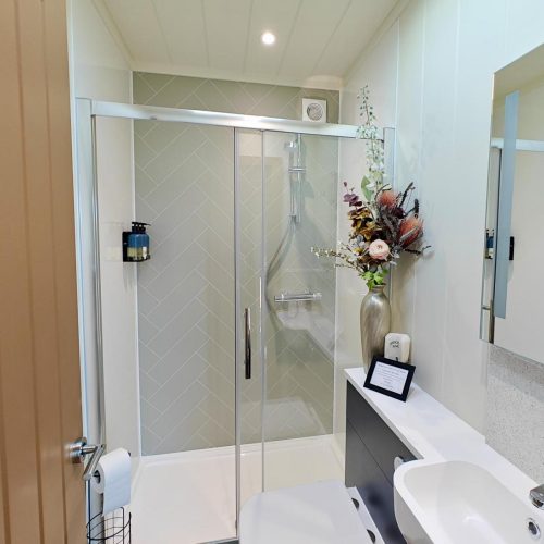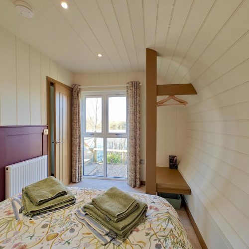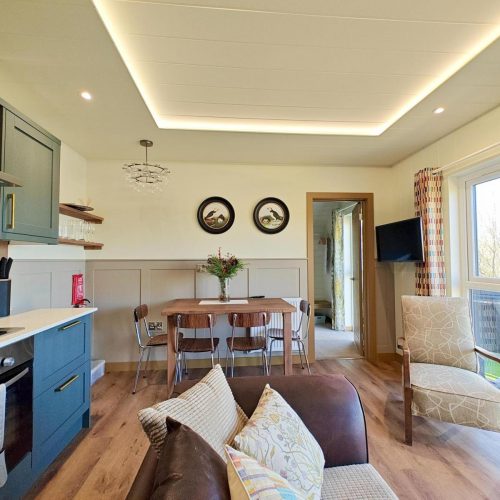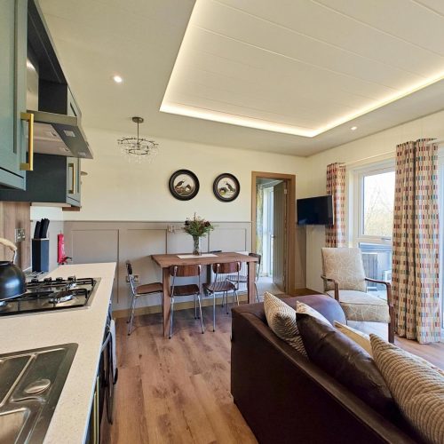 A couple of steps lead up and into this cheery lodge which features a light and stylishly arranged open-plan lounge/kitchen/diner, decorated in fresh, soothing shades. The central lounge space has comfortable seating and a Smart TV, with a charming dining table over by the side and a thoughtfully arranged, fully equipped kitchen to the rear. Exploring the lodge further you will find two cosy bedrooms – a relaxing king-size room and a characterful twin. The accommodation also features a refreshing shower room.