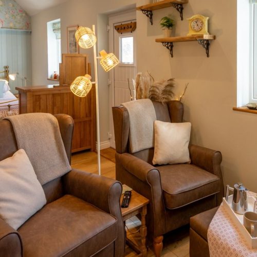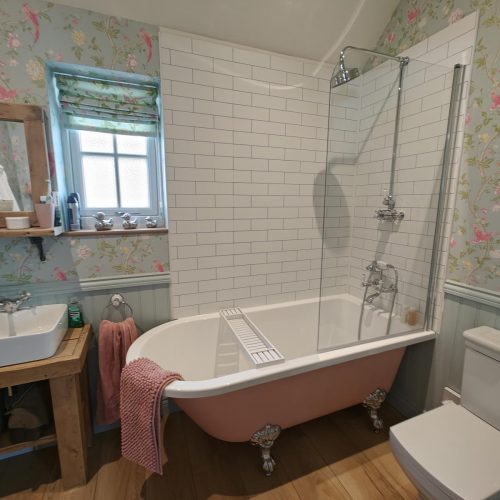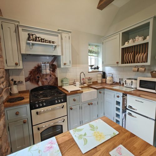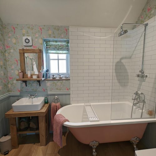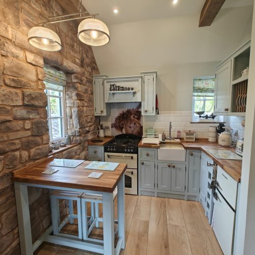 After active days out, this gorgeous holiday home is an oasis of calm. Once home to the boatman who ferried passengers across the river behind the bothy, it’s now a romantic studio-style space for two, renovated to the highest standard and exquisitely detailed. Step inside and at one end of the property, discover the two comfortable armchairs arranged before a Smart TV and a wood-burner-effect gas fire. A striking exposed stone wall adds cohesion as this space continues into a cottage-style kitchen and dining area. At the opposite end of the property, wood panelling and pretty wallpaper provide the backdrop for a beautiful brass-framed bed. Close by, the bathroom is styled just as skilfully, with a roll-top bath which, once filled, is sure to soothe any aching muscles.