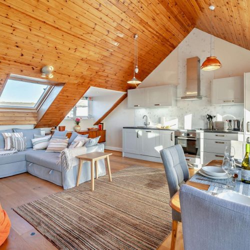As you enter through the front door of this reverse-level cottage, you’ll find yourself in a charming entrance hall, perfect for storing muddy boots. On the ground floor, the first bedroom is a double room adorned with large windows that frame the mesmerising sea views. Next door to the double bedroom is a bright twin bedroom, also offering stunning sea views. The family bathroom, complete with a shower over the bath, provides a convenient and stylish space for relaxation and rejuvenation after a day of seaside adventures. But the magic truly unfolds when you ascend the stairs to the upper level. The entire floor is an open-plan delight, featuring a lounge with Smart TV, a well-equipped kitchen, and a dining area, which are seamlessly integrated for a spacious and sociable feel. The highlight is the set of bi-folding doors that lead to a balcony, allowing you to immerse yourself in the breathtaking panoramic views of the sea. Whether you’re sipping your morning coffee or enjoying a sunset dinner, this space is designed to elevate your seaside experience.