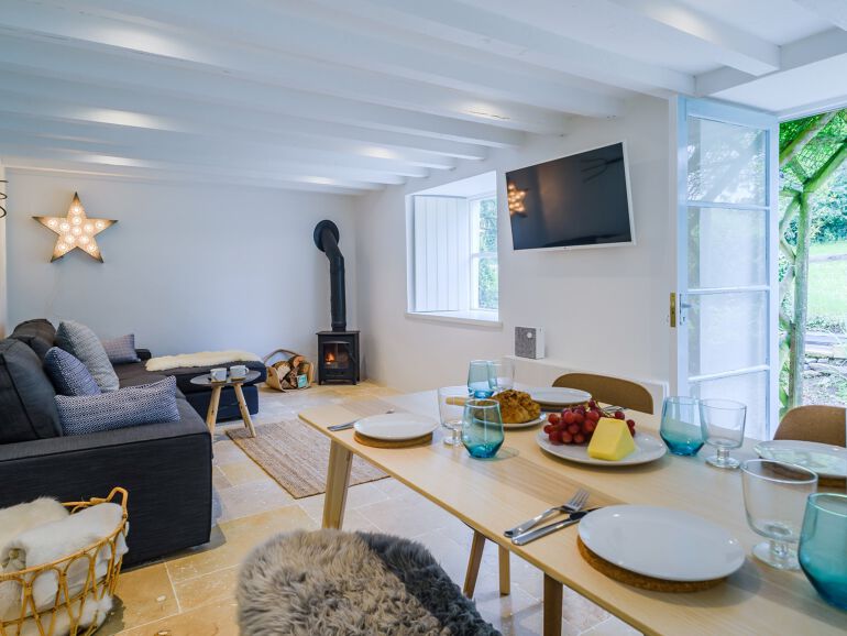 Outside, the delightful fenced garden offers a lawn area, shallow cobbled steps to one side and decked area with BBQ, garden furniture and views over the valley – perfect for evening drinks.