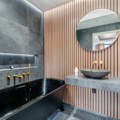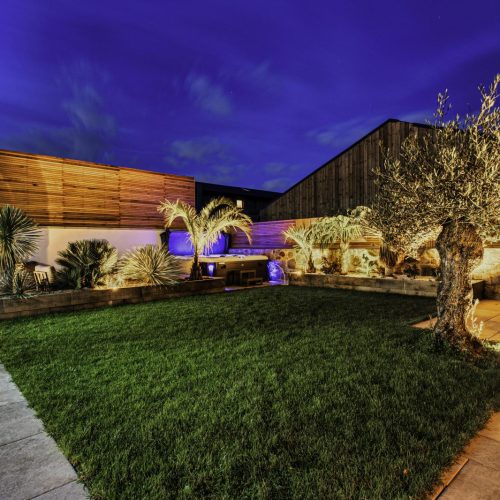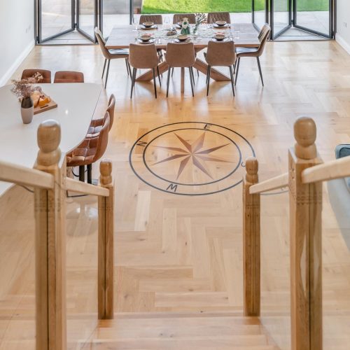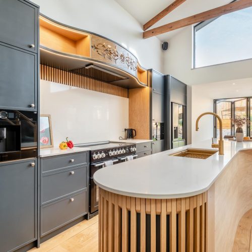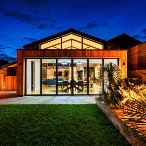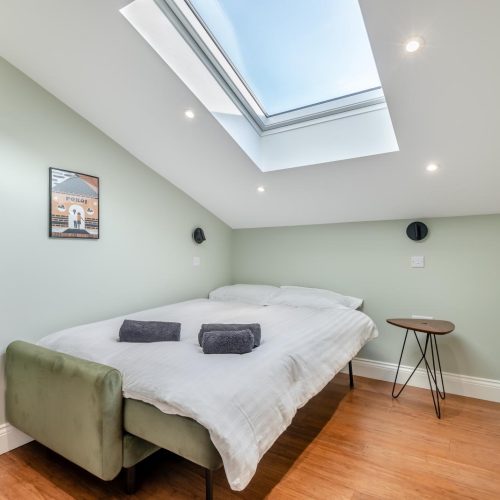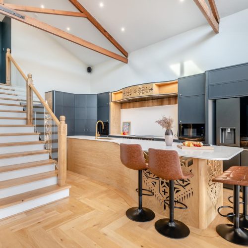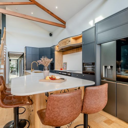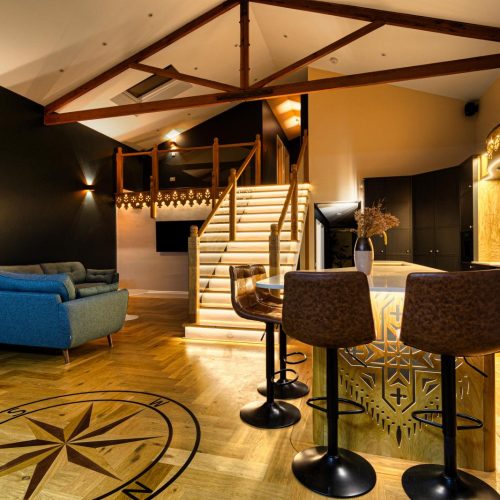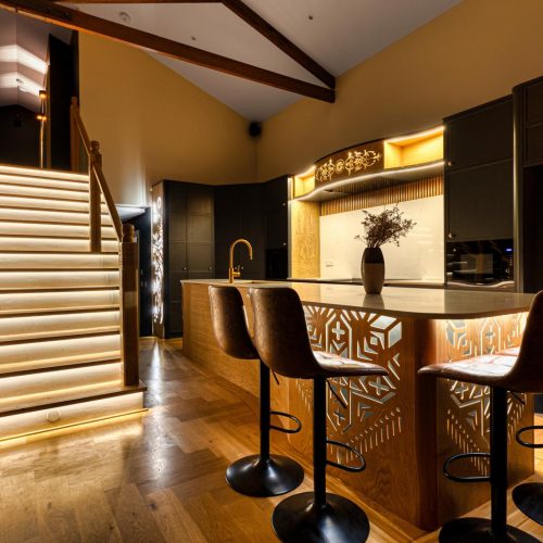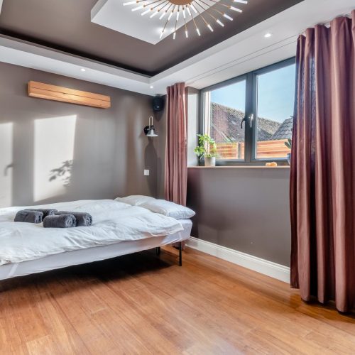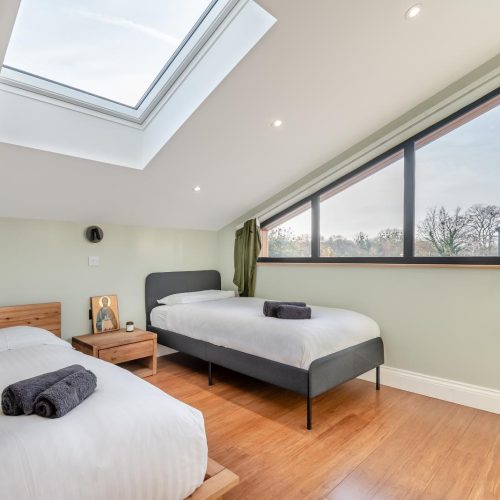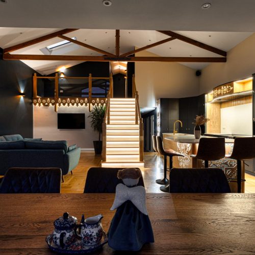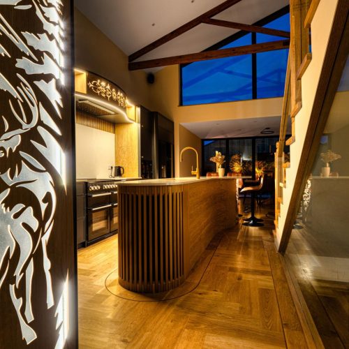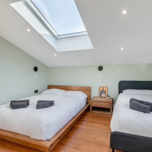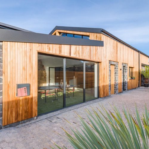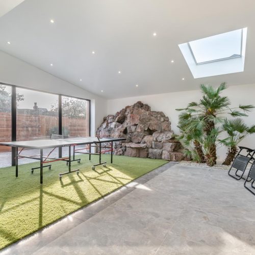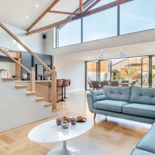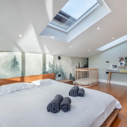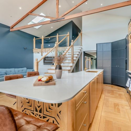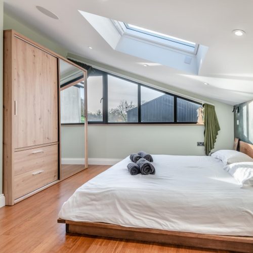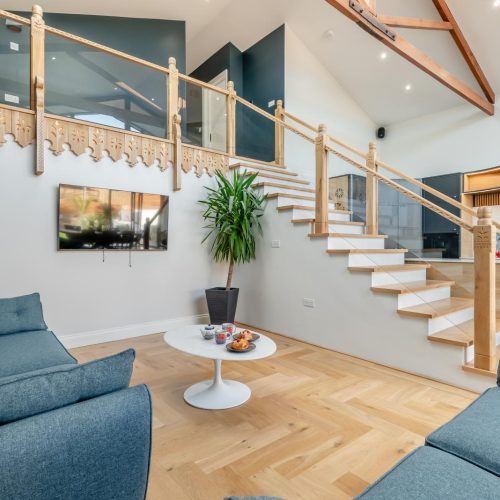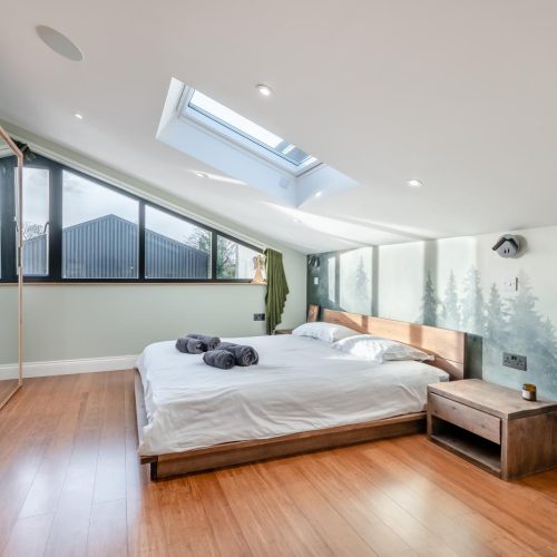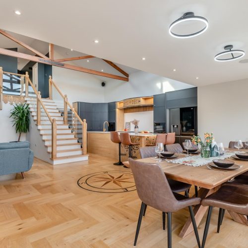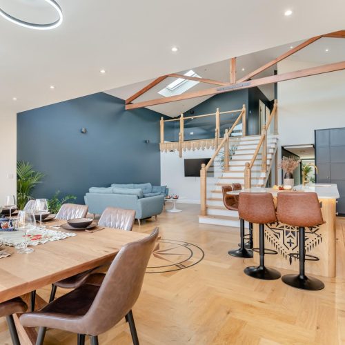 From the entrance to the left, you’ll be met with the indoor games room and inviting sauna. Further along the hallway, there is a double bedroom complete with an en-suite bathroom featuring a free-standing bath. Across the hallway, there is an additional shower room with a WC and a utility room. The enticing hub of the home is located along the hallway where you’ll find an open-plan lounge/diner and kitchen and bi-fold doors which open to the garden. There is great emphasis on lighting and bespoke carpentry adding an alluring ambiance to the property. The underfloor heating throughout is a welcome addition on chilly evenings. Upstairs on the mezzanine level, you’ll find a king bedroom with additional sofa bed, a twin bedroom and a double bedroom all decorated in a calming neutral palette. Further highlights include vaulted ceilings and expertly appointed lighting. The enticing family bathroom features a bath and a separate shower.