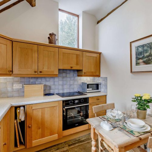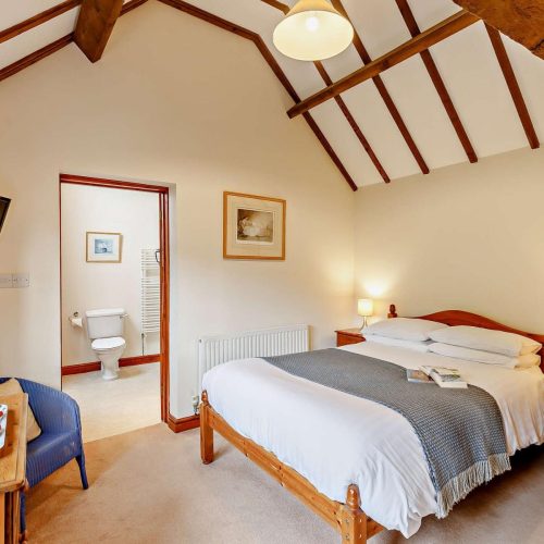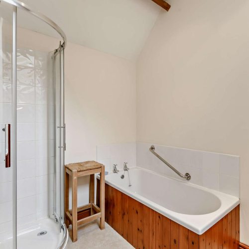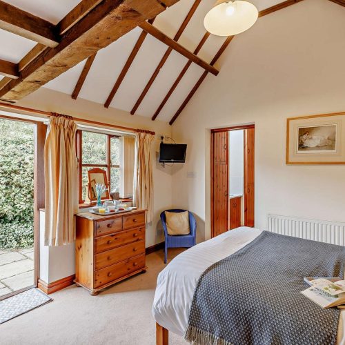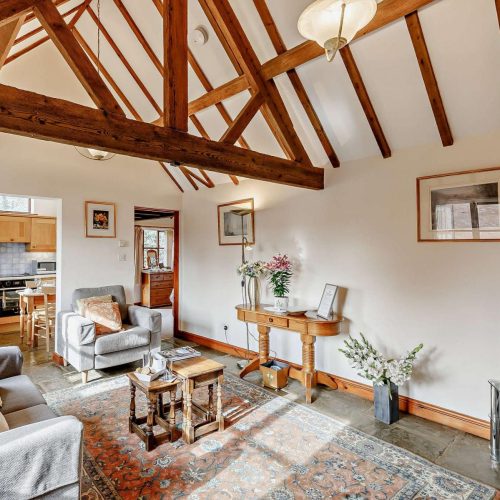 Arriving at the lovely farmhouse entrance door, you are invited into the hallway with downstairs WC, where you can conveniently store wet or muddy coats and wellies. Leading through to a beautiful spacious lounge/diner with beautiful high pitched ceilings, original oak beams and a prominent fireplace with gas-fired burner, inviting you to snuggle on the sofa by the fire with a captivating book or perhaps spoil yourself with a glass of wine or two. If you stay in for a meal, there is a fabulous fitted country kitchen with views out to the garden and bespoke oak cabinets that sit well with the oak dining table and chairs for two. Well-equipped including an electric oven with hob, microwave, fridge/freezer, washing machine and tumble dryer and dishwasher to save washing the dishes. On the same floor, you will find a double bedroom with TV and ensuite bathroom with bath, shower cubicle, wash basin and WC.