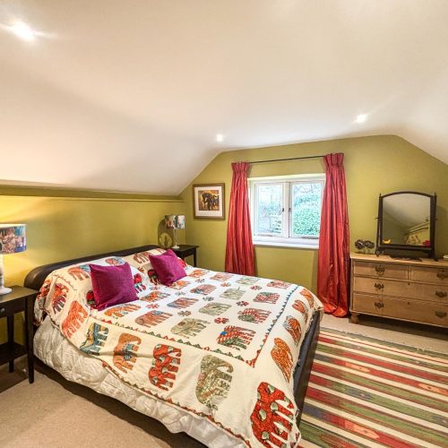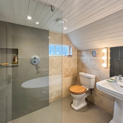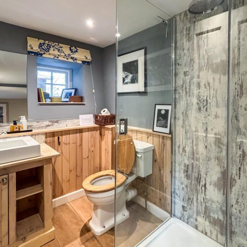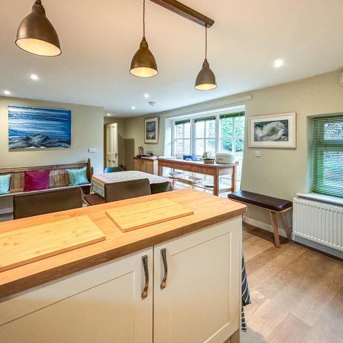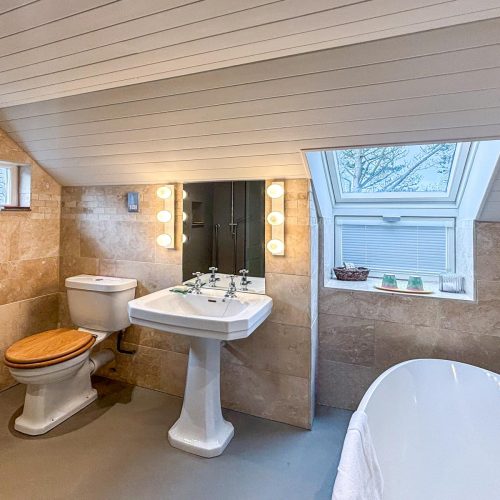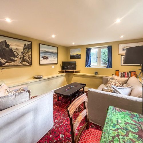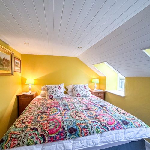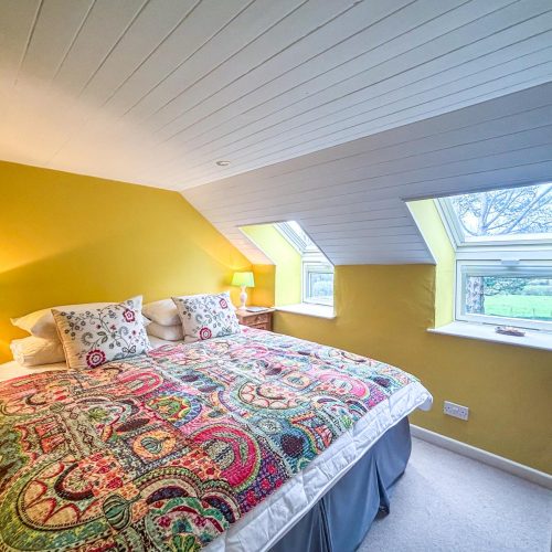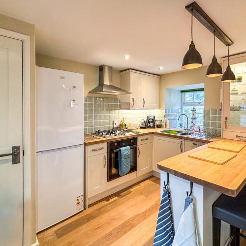 You’ll enter this welcoming retreat into the bright and airy kitchen/diner, which has a cosy wood burner to keep you all toasty on chilly evenings. The kitchen, accented with elegant wood, has everything you need for food prep, including a coffee machine for whipping up your morning flat white (don’t forget your favourite ground coffee). A large window fills the space with natural light and shows off a view of the owner’s (unused) courtyard. A small step leads into the sitting room, a snug haven with a squishy sofa, an armchair and a desk for if anyone needs to attend to work. Choose a book from the collection or unwind with a film after a day at the beach. There’s also a handy shower room with WC downstairs. Upstairs, the landing leads to two beautifully presented bedrooms, each with a cheerful colour scheme. The first bedroom has a king-size bed, while the second, with its cheerful yellow décor and colourful throws, can be arranged as a twin or a super-king to suit your needs. The delightful family bathroom features a walk-in shower and a freestanding bath.