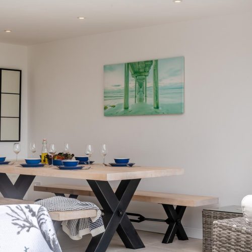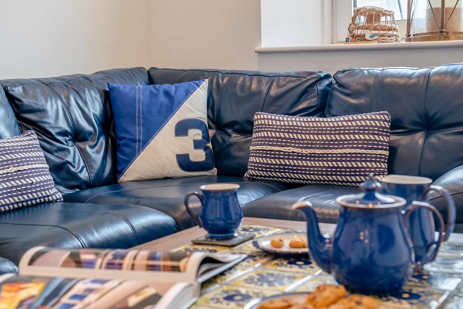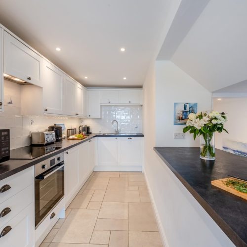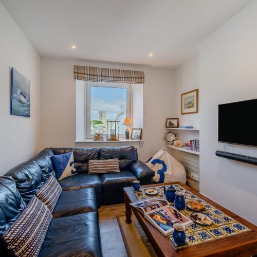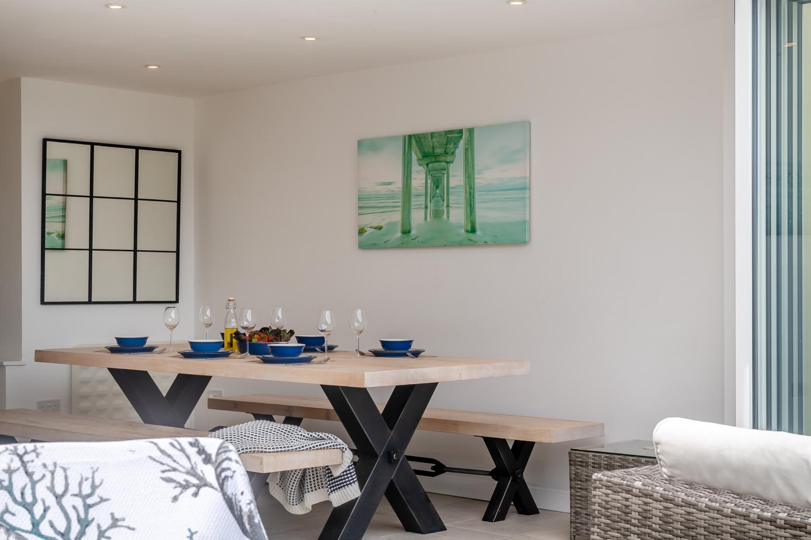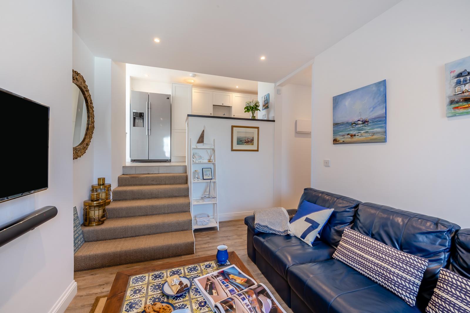 From the hallway, make your way into the cosy yet stylish lounge, with thoughtful decor, a large family sofa, and a TV for evening entertainment. Up a few steps is the sleek, tiled kitchen that opens out into a wonderful dining area with floor-to-ceiling bi-folding glass doors enjoying picturesque sea views over the terrace. At the front of the property, you will find two bright and comfortable bedrooms, one of which is accessed via a few internal steps, as well as two stylish bathrooms.
