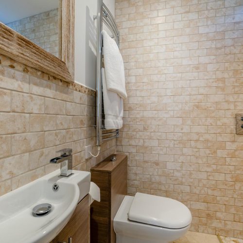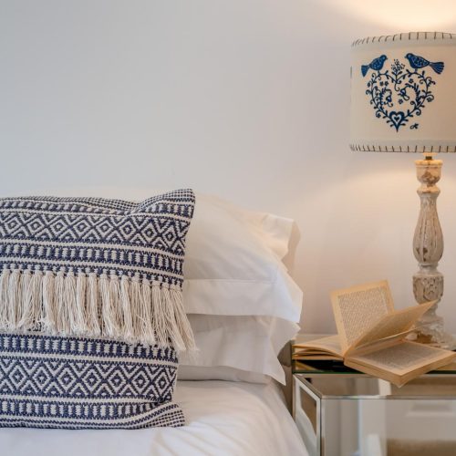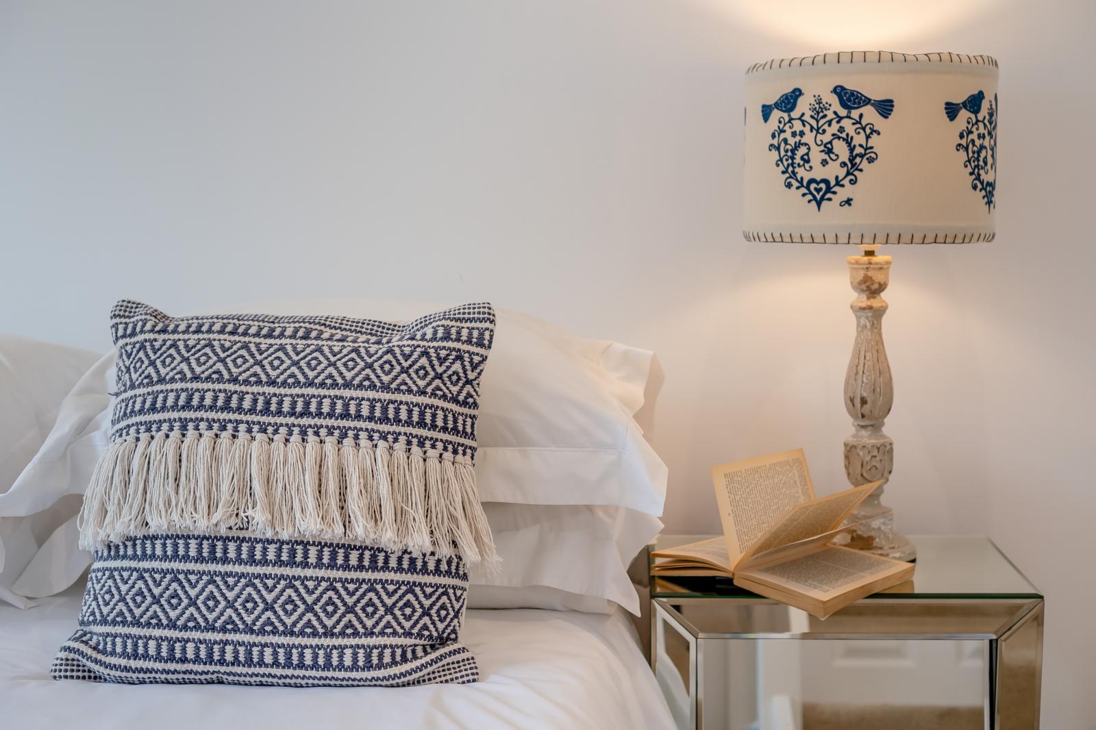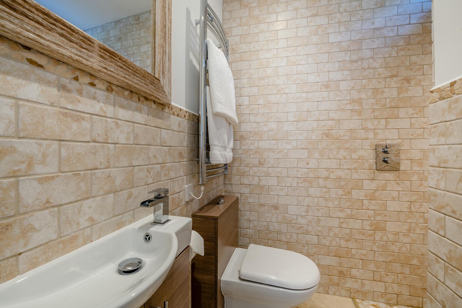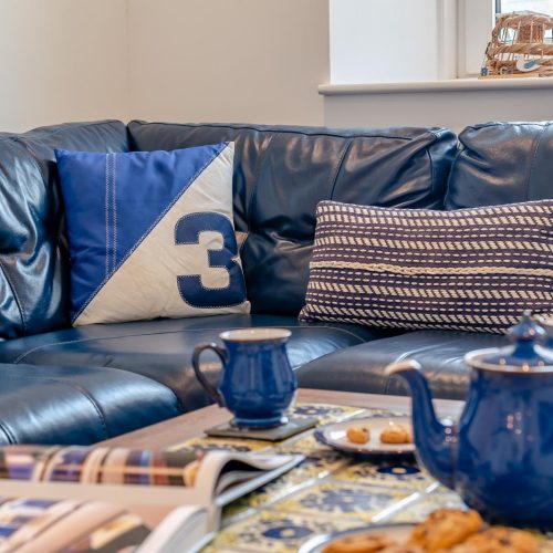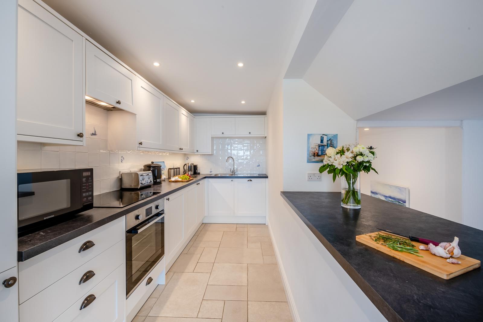 From the hallway, make your way into the cosy yet stylish lounge, with thoughtful decor, a large family sofa, and a TV for evening entertainment. Up a few steps is the sleek, tiled kitchen that opens out into a wonderful dining area with floor-to-ceiling bi-folding glass doors enjoying picturesque sea views over the terrace. At the front of the property, you will find two bright and comfortable bedrooms, one of which is accessed via a few internal steps, as well as two stylish bathrooms.