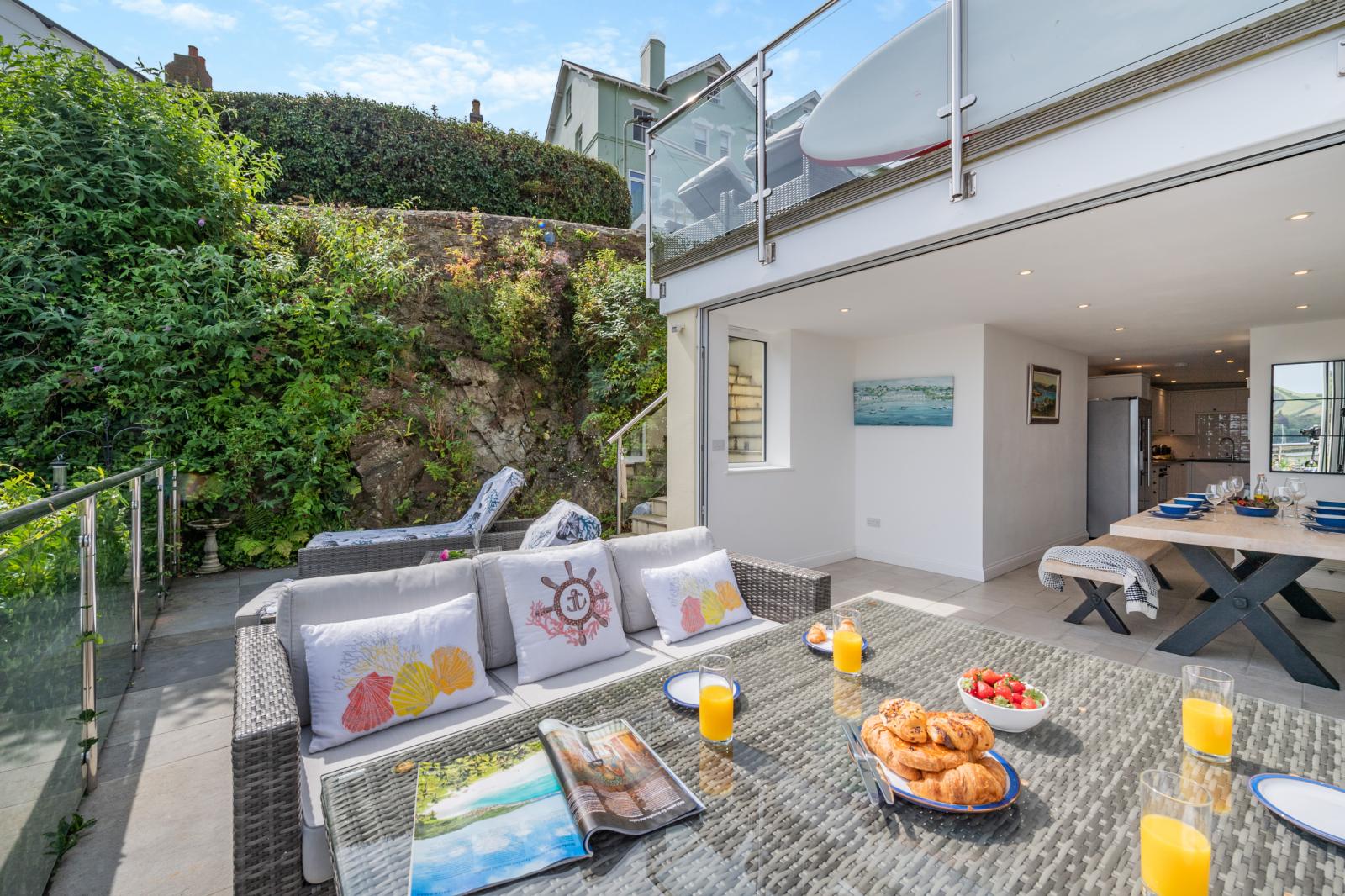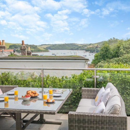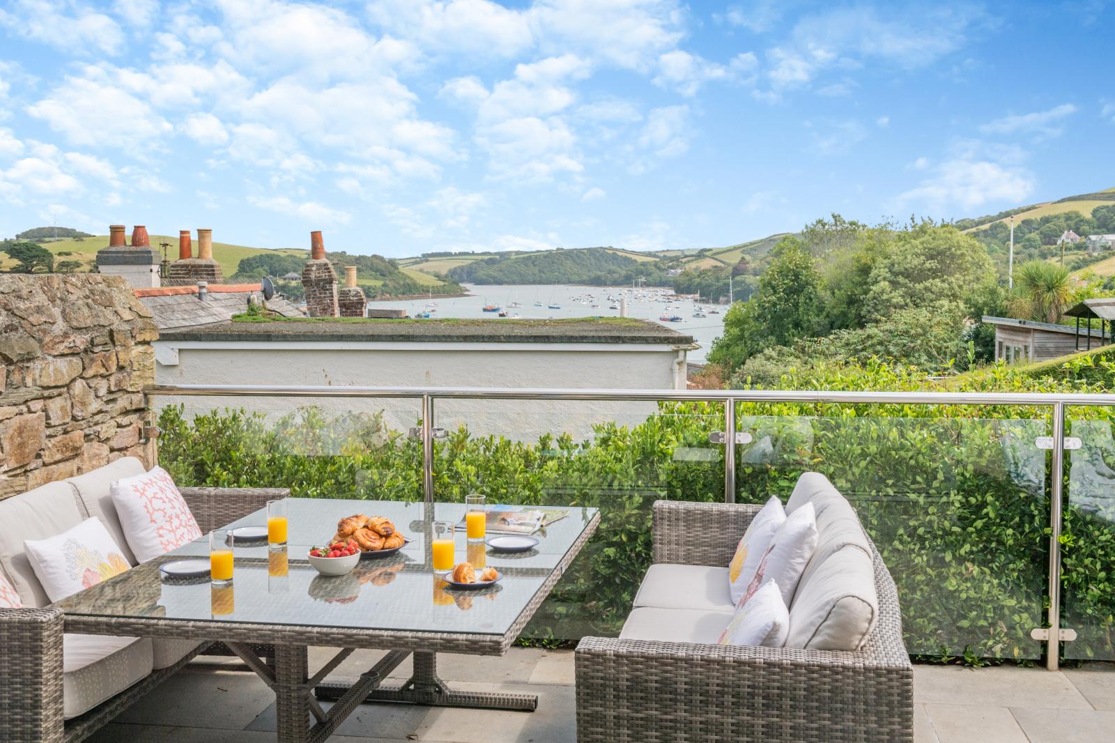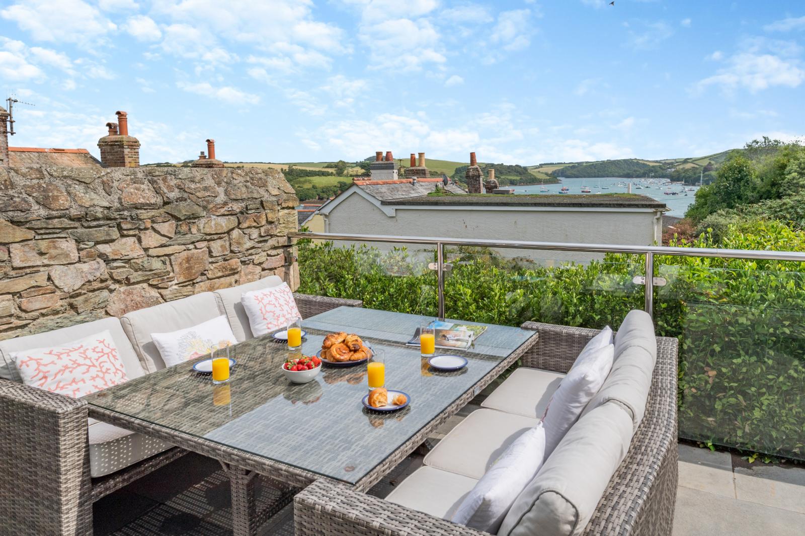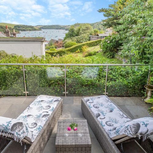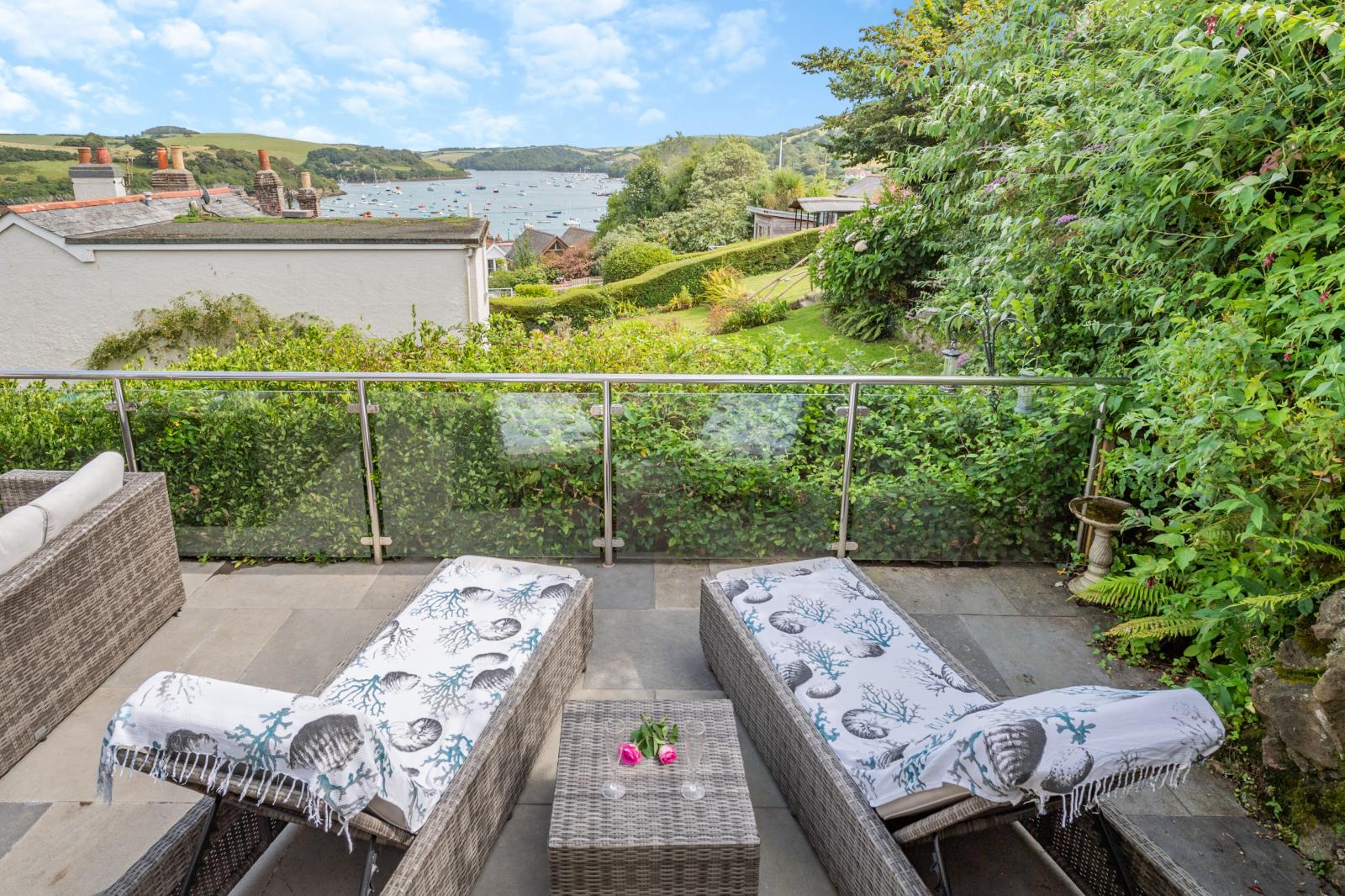 Exit through the dining room onto the balcony terrace, a sun-trapped patio with sun loungers and a sociable seating area to make the most of the idyllic Salcombe estuary views.
