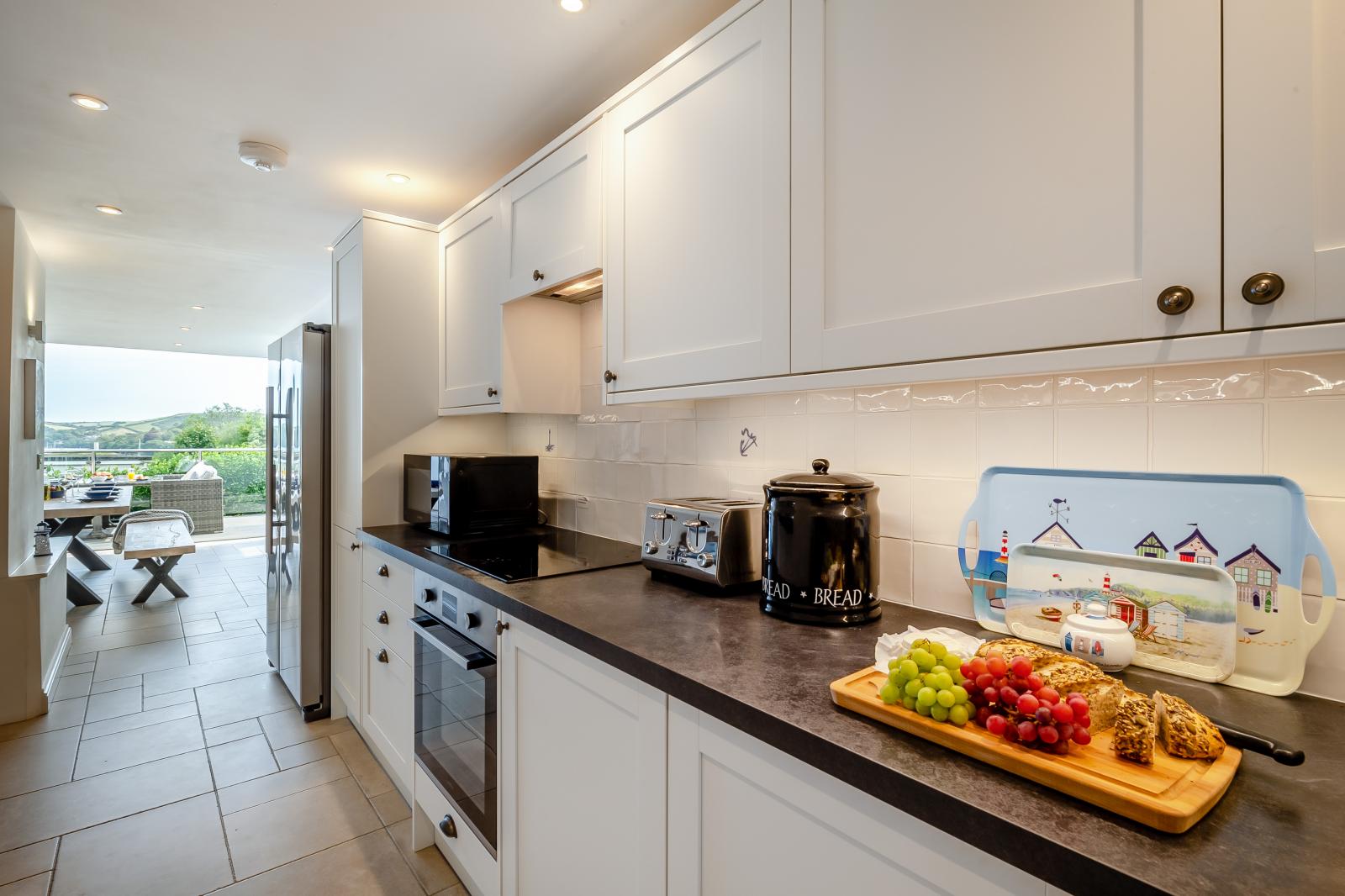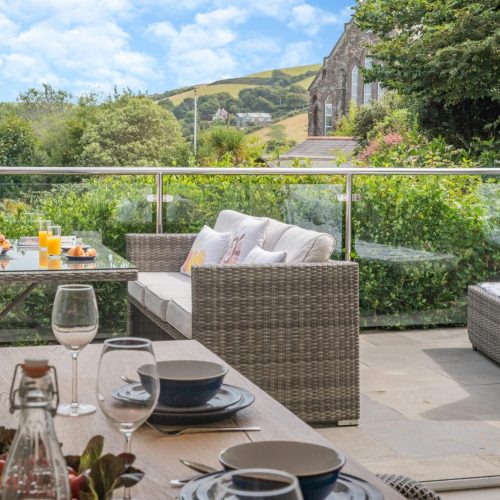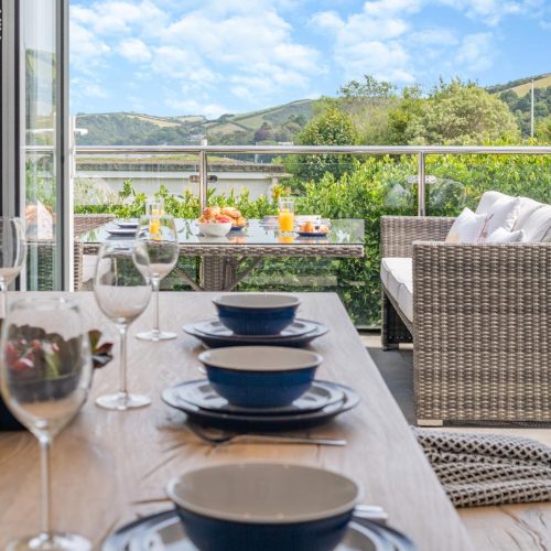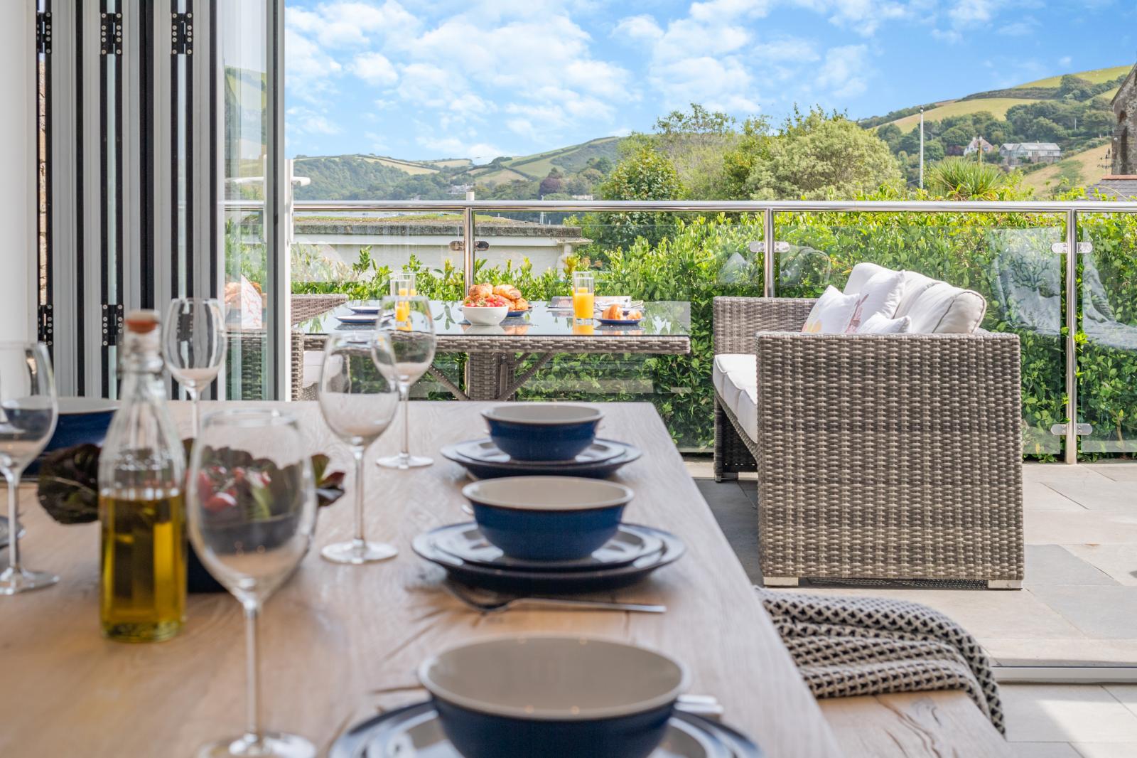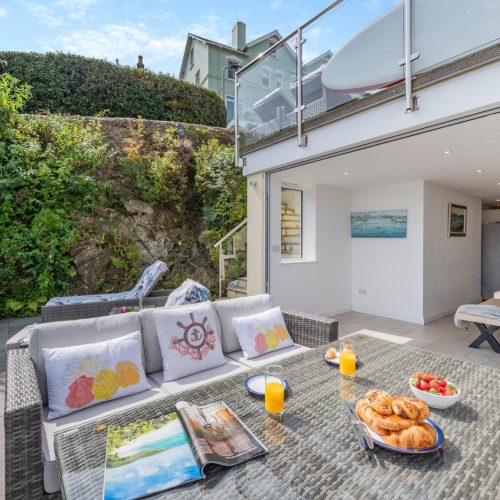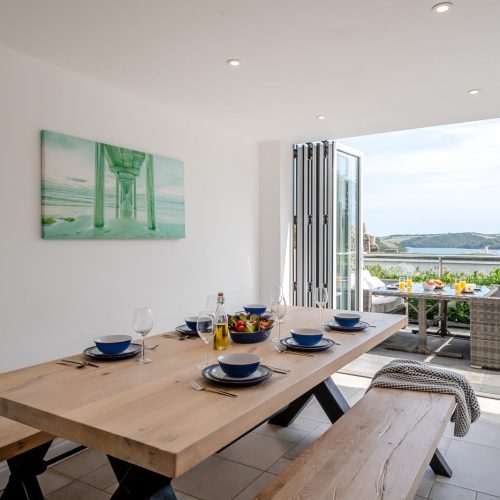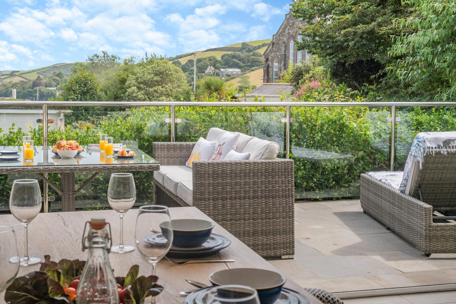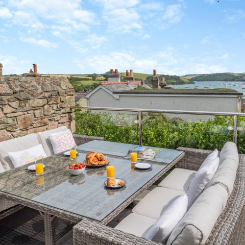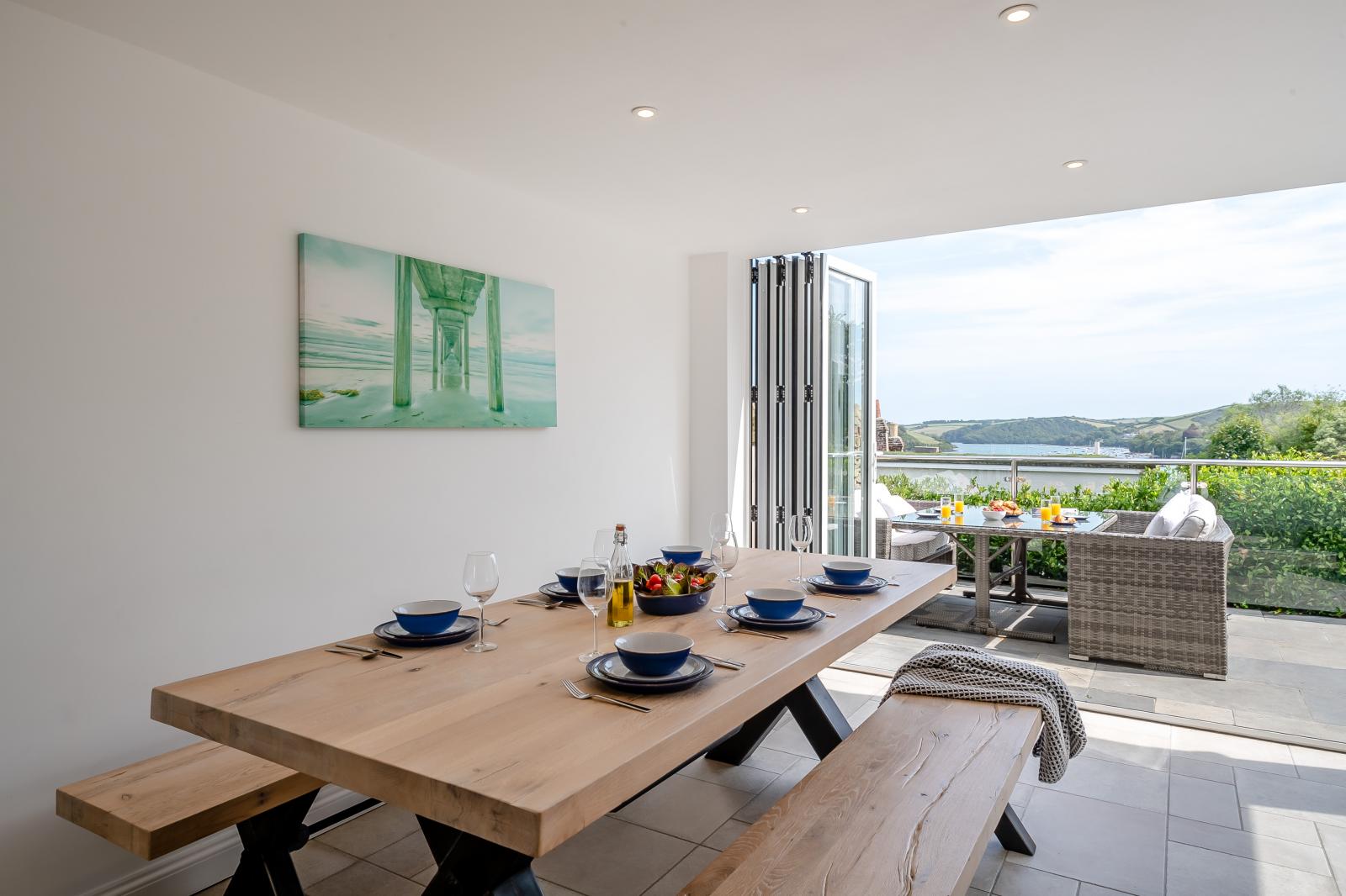 Exit through the dining room onto the balcony terrace, a sun-trapped patio with sun loungers and a sociable seating area to make the most of the idyllic Salcombe estuary views.