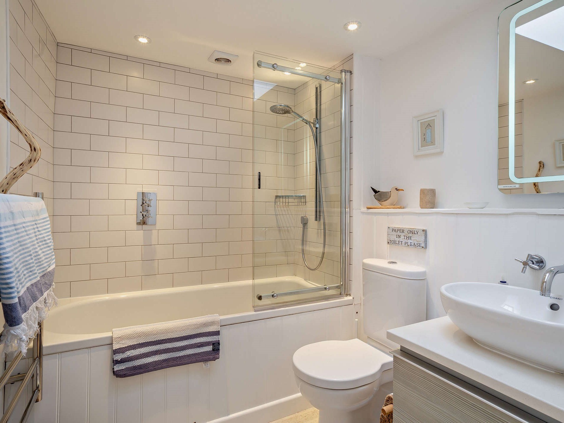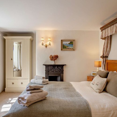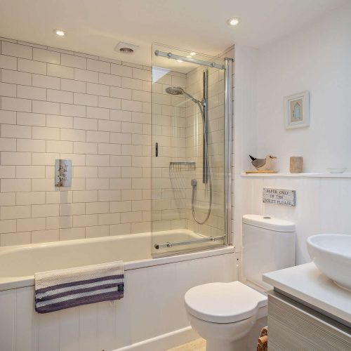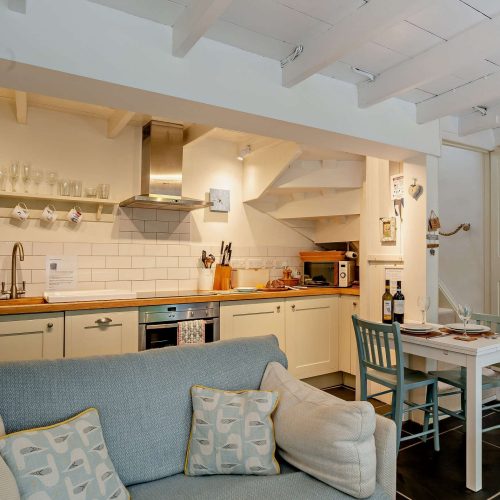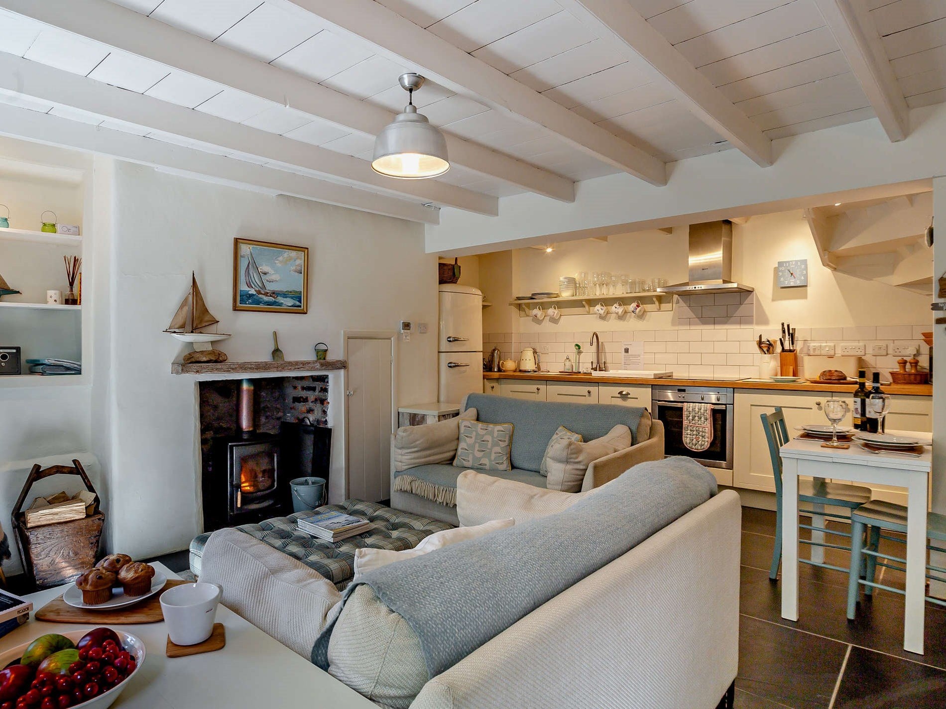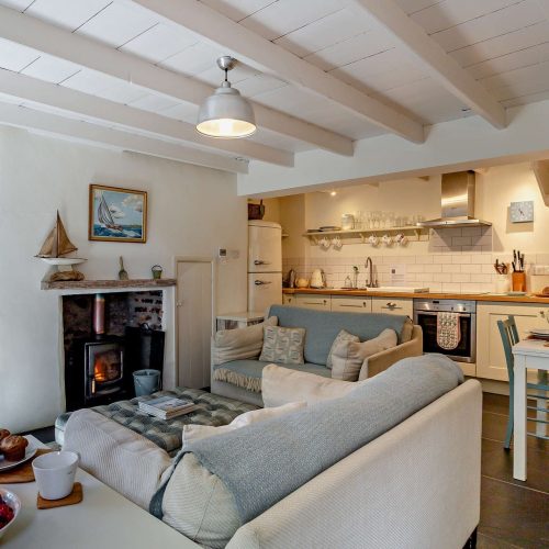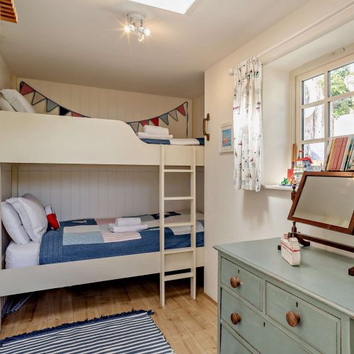 Step inside this welcoming cottage from the lane and into a warm and inviting open-plan living space that feels light and airy, thanks to whitewashed walls and ceilings. With underfloor heating and a central wood burner, the lounge area is the perfect place to unwind on the two comfortable sofas arranged around the smart TV and fireplace. Gather at the dining table for hearty meals or a fun-filled games night, while the well-equipped kitchen at the rear provides plenty of space to cook delicious local produce. Up the curved staircase, you’ll find a beautiful bunk bedroom, as well as a spacious king-size master bedroom. The gleaming family bathroom completes the internal layout.