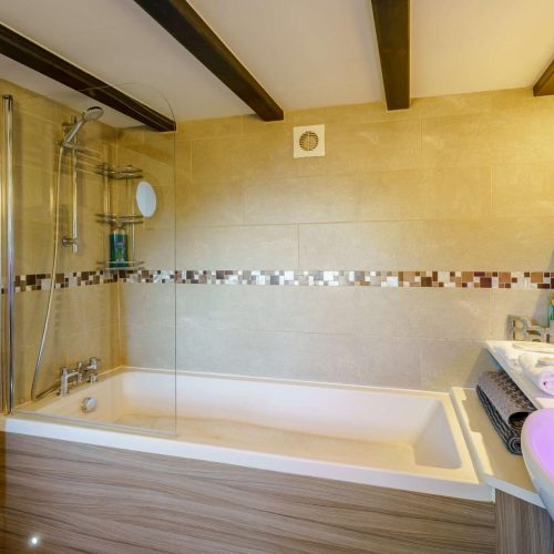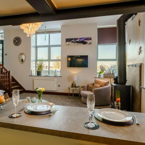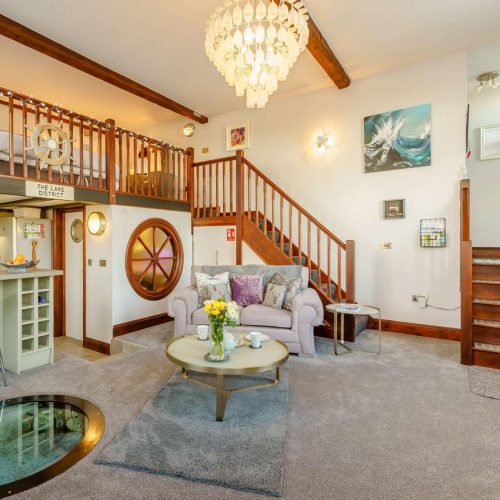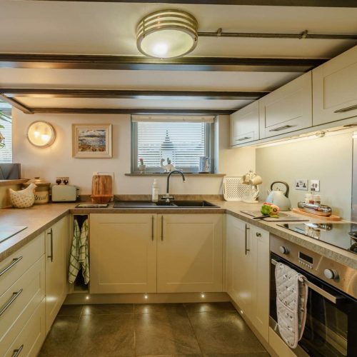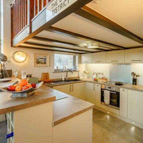 Enter this delightful property and you will instantly be in awe of your accommodation. Head down a few steps into the cosy open-plan kitchen and sitting area. Relax on the comfortable sofa or armchair, watch a movie on the Smart TV and enjoy peaceful nights in front of the wood burner after a day exploring the beautiful local area. There is the stunning feature of an old well which has lighting and a glass cover which creates a feature you won’t see anywhere else. The breakfast bar/dining area is ideal for romantic meals allowing for sociable cooking and dining. Just off the kitchen is the bathroom with amazing features to make you feel as though you are on a boat at sea. Up to the first-floor mezzanine level, you will find the bedroom with lots of natural light, lovely A-frame exposed beams and a super king-size bed with ample storage space.