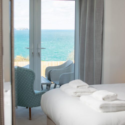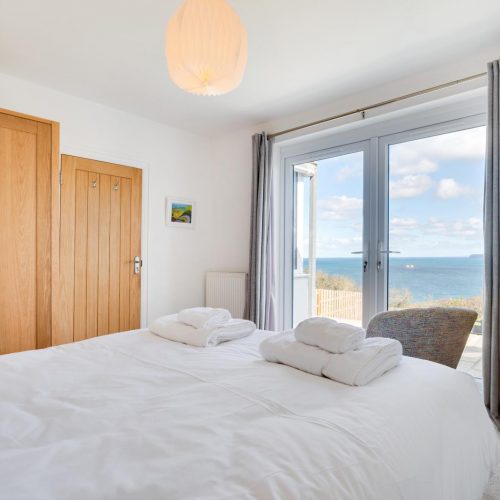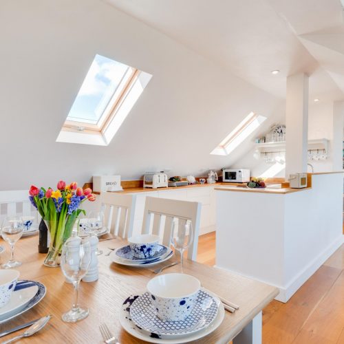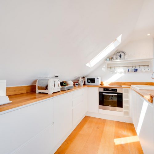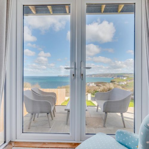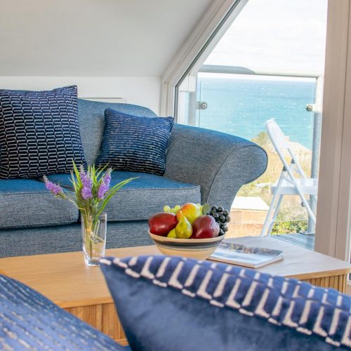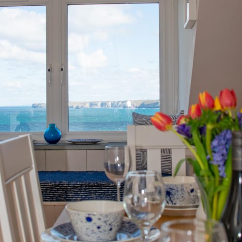 As you enter the property you will be met with a hallway with cupboards containing essential appliances. On the ground floor are the three bedrooms and a modern, family bathroom with a shower over the bath. The master bedroom boasts a king-size bed, French doors which lead to a delightful patio area with sea views and an en-suite with a shower and WC. Inside the second bedroom, you will also find a comfortable king-size bed and the third bedroom is a twin room. Climb the stairs to the first floor to reach the open-plan kitchen/lounge/diner. The cosy living area with two plump sofas and an armchair, beside the fireplace and TV. This space is lit up by the natural light which pours in through the large French doors which lead out onto the balcony with impressive views of the countryside and sea. There is also a window seat for relaxing with a coffee and a good book while admiring the views. Prepare a hearty meal with some fresh Cornish produce in the neat ‘U’-shaped kitchen. When it’s time to dine with your guests, sit at the wooden table and chairs.