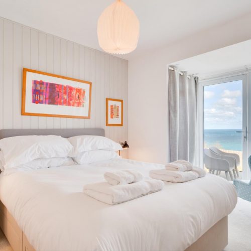 Outside you will find a private, enclosed garden surrounded by fencing. There is a grassy area, a gravelled section, decking and pretty shrubs at the far end. Dine alfresco on a warm evening on the garden furniture while admiring the far-reaching sea views. There is also a balcony on the first floor with seating.