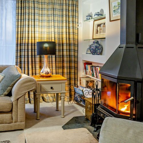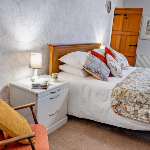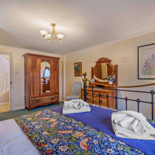 The beautifully furnished cottage, with ample parking is the perfect escape for relaxation and freedom and is perched high on a hillside and inspired by William Morris’ designs for an outstanding, colourful appearance. Perfect for family celebrations and reunions! Enter via the upper ground floor into a charming fully equipped country kitchen, complete with a dining table which is big enough to seat 10 for tucking into hearty meals together. Here you can enjoy panoramic fell views framed by the kitchen windows and watch Herdwick sheep graze by the garden fence. It is such a joy to observe the new born lambs gambolling alongside their mothers! Adjacent to the kitchen, is a welcoming lounge with a warming wood burner, Smart TV, books, maps and guide books, tourist information, puzzles and games. French doors open out to a south and west facing balcony overlooking the picturesque gardens, village and hills.